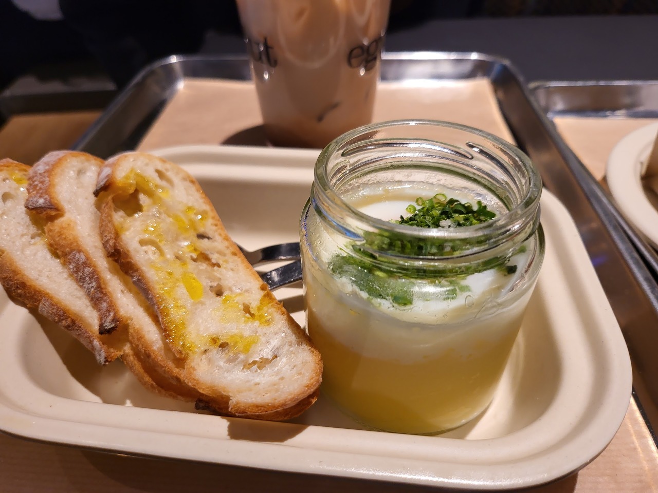 곁들여 나오는 바게트야 뭐 올리브유 뿌린 바게트라 평이했고, 중요한 슬럿은.. 갑자퓌레에 계란을 곁들인 커들드에그라....